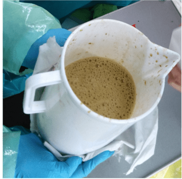 Il liquido estratto, di per sé fluido (Fig. 4), è stato filtrato con un colino a maglia larga per le rare fibre medie, suddiviso in aliquote per le analisi a cura delle due Unità Operative, sottoposto alla misurazione del pH e tempestivamente conservato a temperatura di -80° C.