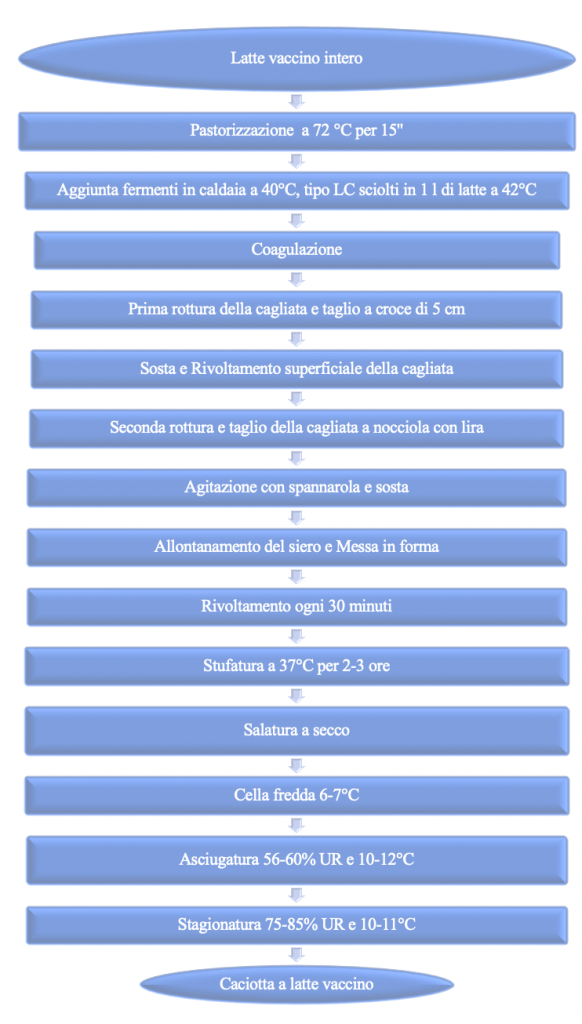 Il mattino seguente, il latte dei due gruppi è stato pastorizzato (a 72°C per 15” e raffreddato a 39°C) e sottoposto al processo di caseificazione del formaggio tipo caciotta, secondo il flow-chart sotto riportato.